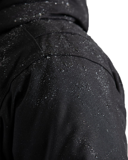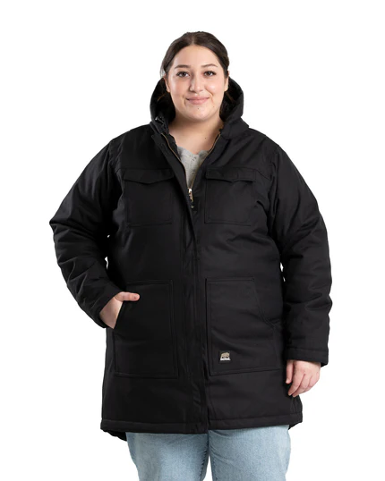 - Three-piece insulated hood with elastic drawcord and toggles, hidden storm cuffs and extended mid-thigh length block the cold